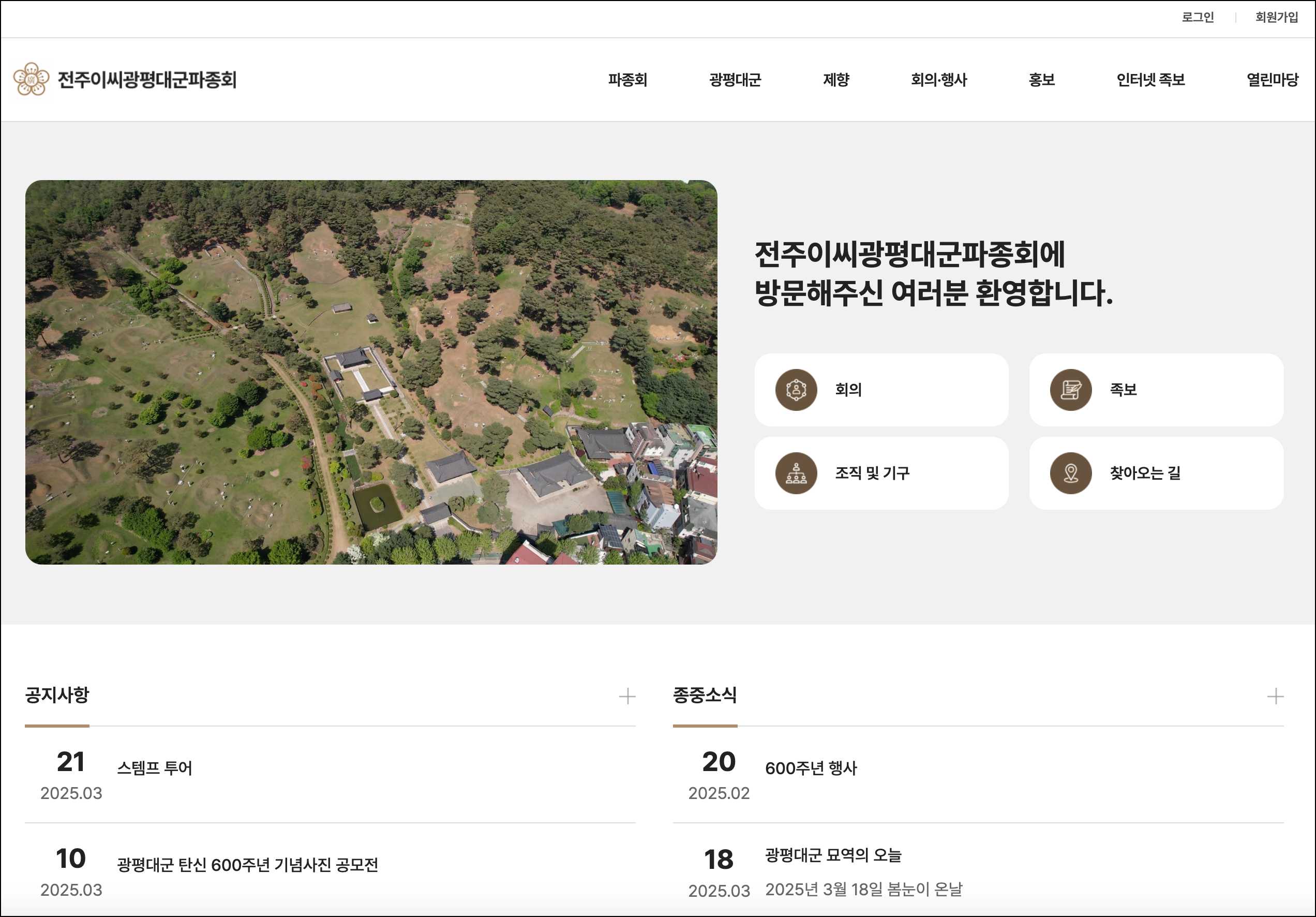 홈페이지는 전체적으로 간결하고 고풍스러운 분위기를 갖추고 있으며, 주요 메뉴는 종회 소개, 광평대군 관련 역사, 족보 안내, 후손 활동 소식, 사진자료 등으로 구성되어 있습니다. 방문자는 누구나 기본적인 문중 정보와 활동 내용을 열람할 수 있으며, 회원 가입을 통해 더 많은 자료에 접근할 수 있는 구조입니다.