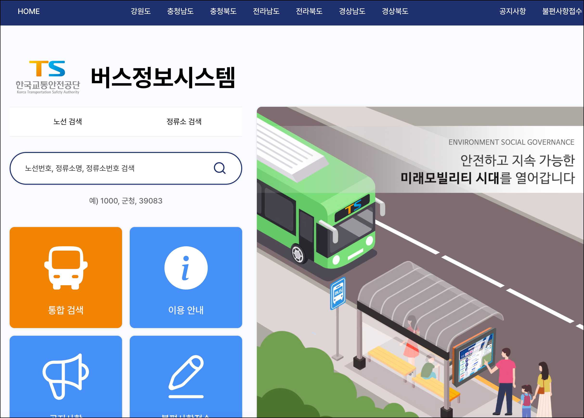 TS 광역 버스정보시스템([http://www.tsbis.kr)은](http://www.tsbis.kr%29은) 중소도시에서도 대중교통을 보다 효율적으로 이용할 수 있도록 돕기 위해 마련된 실시간 버스 정보 서비스입니다. 한국교통안전공단이 운영하며, 자체적인 교통 시스템을 구축하기 어려운 지자체들을 중심으로 서비스가 확대되고 있어요.