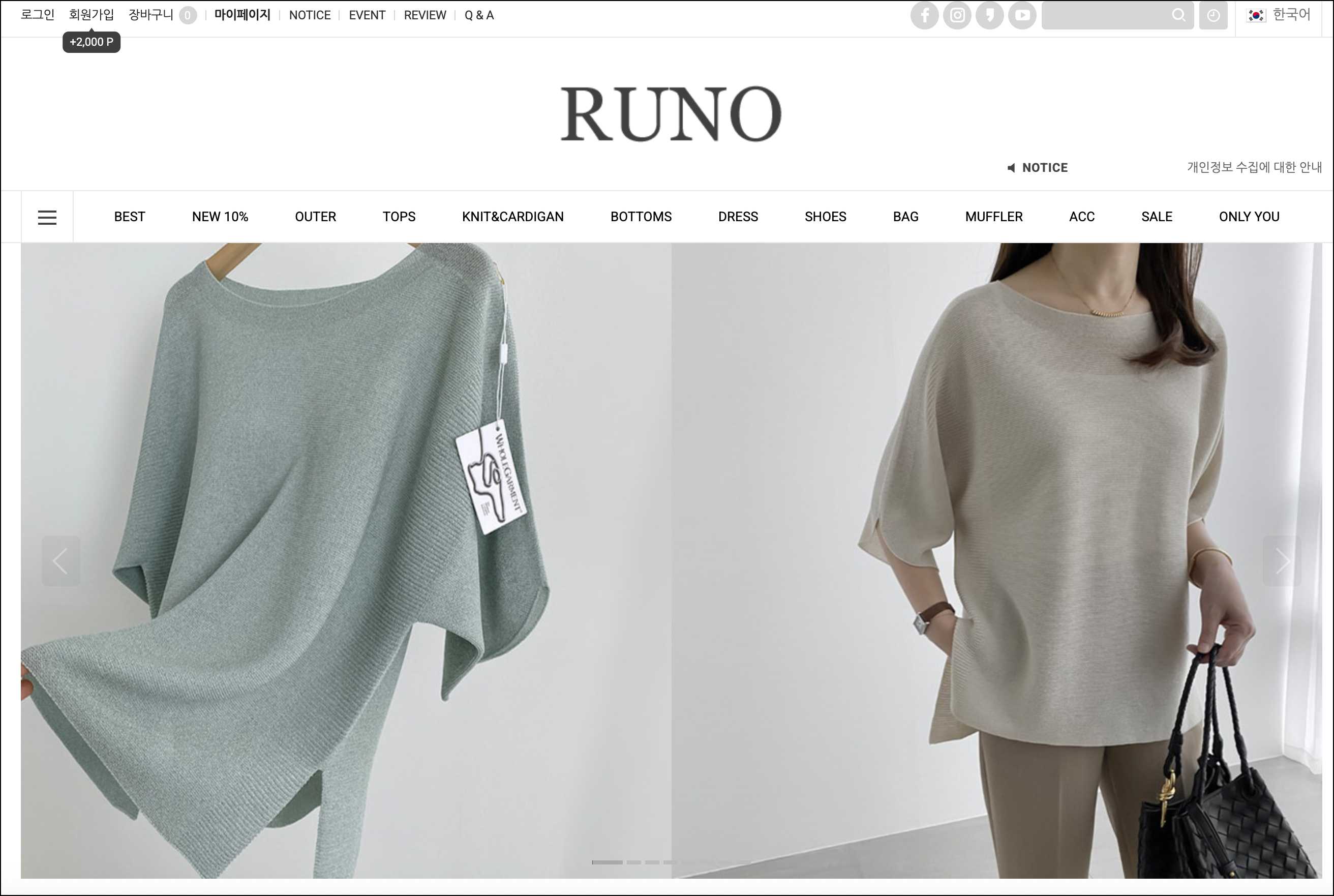 SNS도 꽤 꾸준히 운영되고 있어서 인스타그램(@runo.kr)에서는 신상품 스타일링이나 착용컷 등을 참고할 수 있고, 요즘 감성에 맞는 무드로 구성돼 있어 보기에도 깔끔합니다.