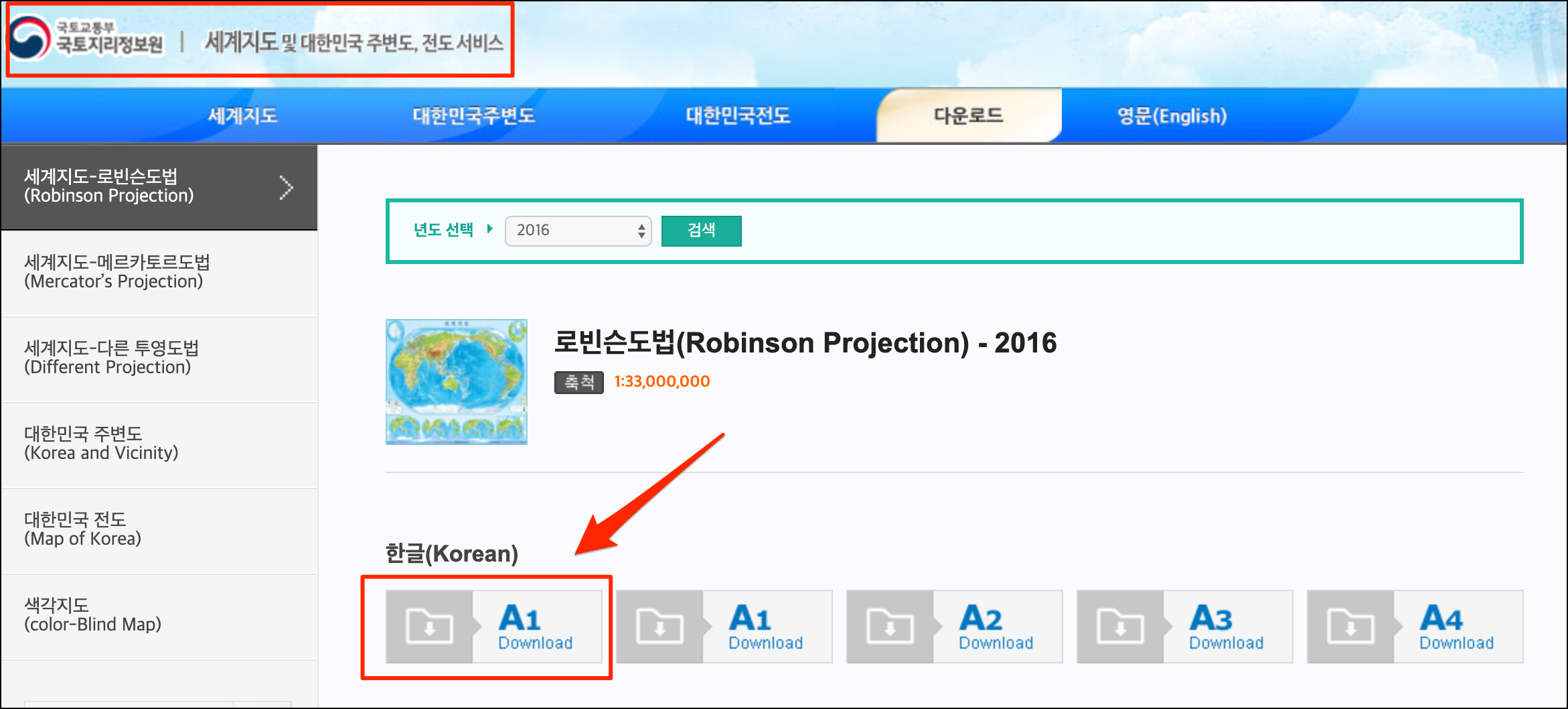 국토교통부 > 국토지리정보원에서 제공하는 지도서비스 입니다. 이 사이트에 가보면 세계지도를 사이즈별로 다운로드 받을수 있도록 제공하고 있는데, 세계 지도 크게보기를 하기 위해서는 A1 사이즈로 다운을 받아보세요. 파일크기가 무려 22메가나 하더라구요. 그만큼 초고화질 자료입니다. 너무 커서 티스토리에는 업로드도 불가능하네요..ㅠㅠ. (10메가 넘으면 불가)