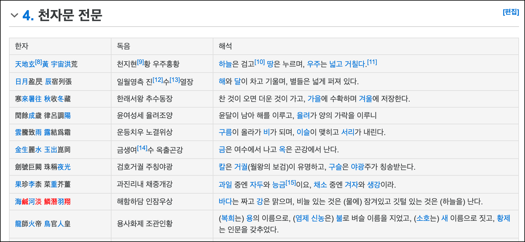 나무위키에 천자문 순서대로 잘 정리되어 있어서 소개합니다.