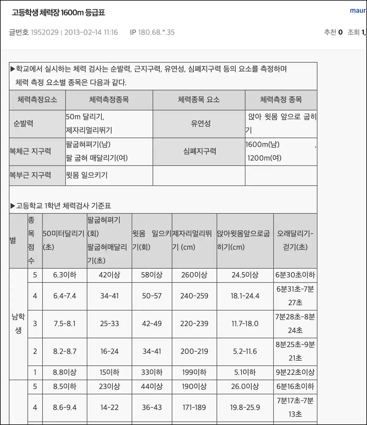 고등학생 체력장 1600m 등급표 : MLBPARK