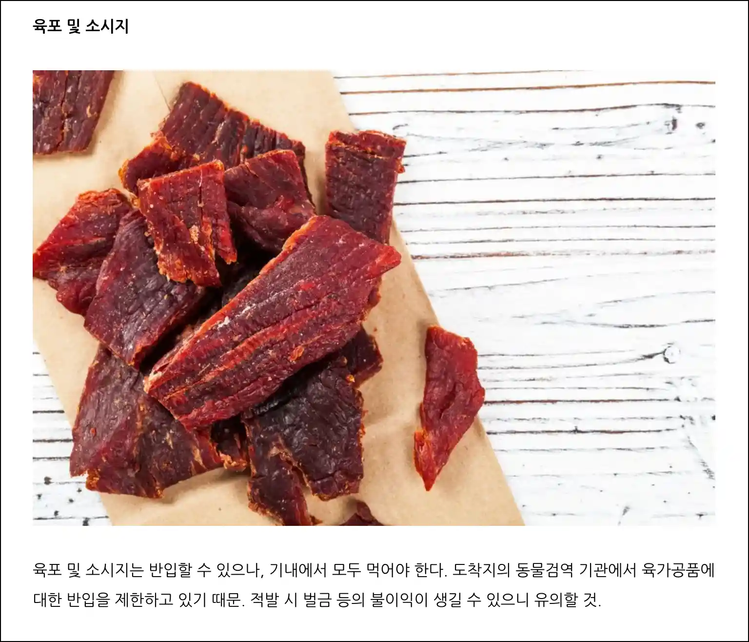- 육포, 소시지: 반입 가능하나 도착지에서의 검역 규정을 확인해야 함.
