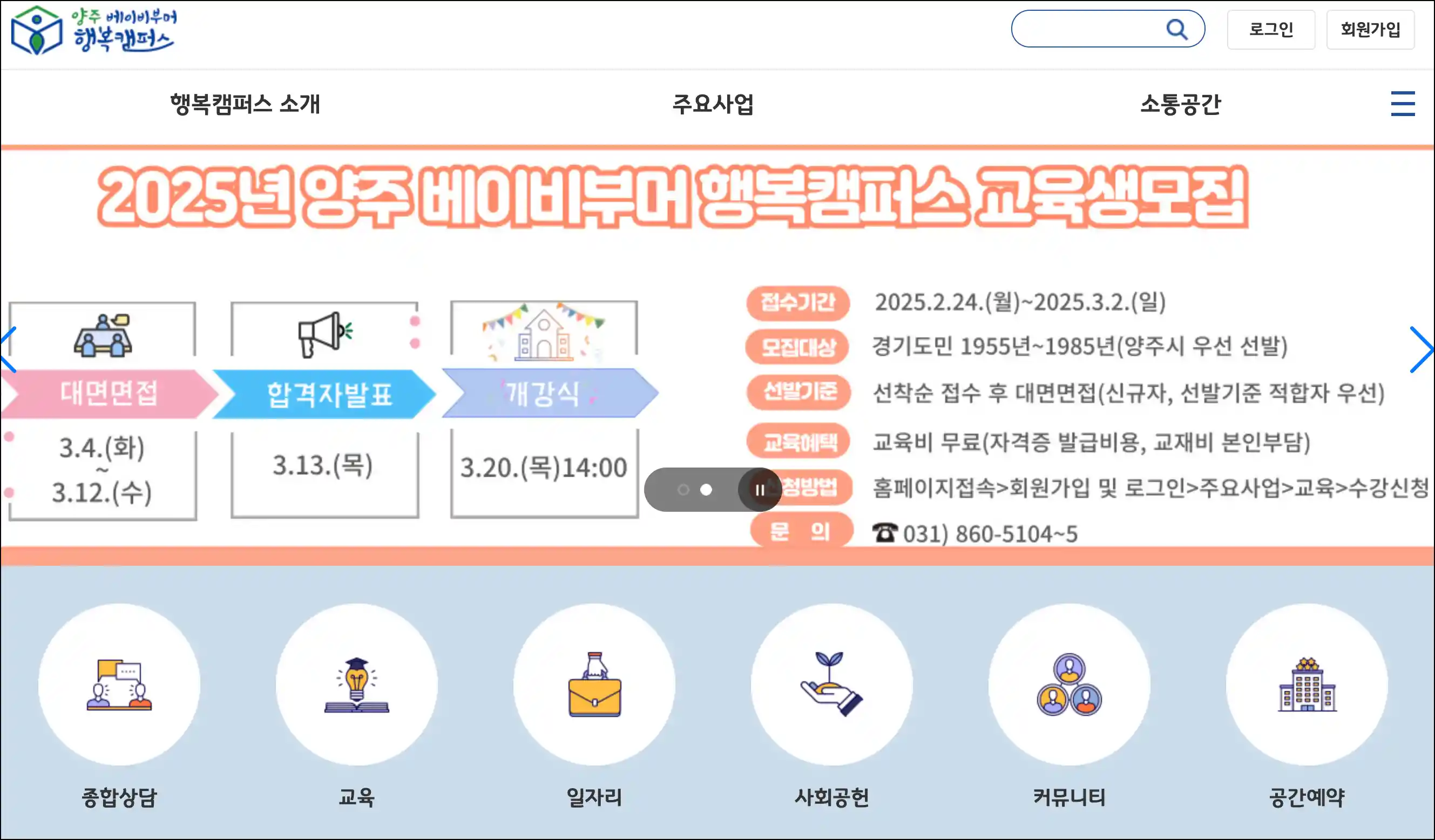 양주 베이비부머 행복캠퍼스는 40~60대 베이비부머 세대를 대상으로 다양한 교육과 활동 프로그램을 제공하는 플랫폼입니다. 이를 통해 중·장년층이 새로운 기술을 배우고, 취·창업을 준비하며, 여가와 건강을 증진할 수 있도록 지원합니다. 주요 프로그램으로는 직업교육, 취·창업 지원, 문화·예술 강좌, 건강 증진 활동 등이 있습니다.