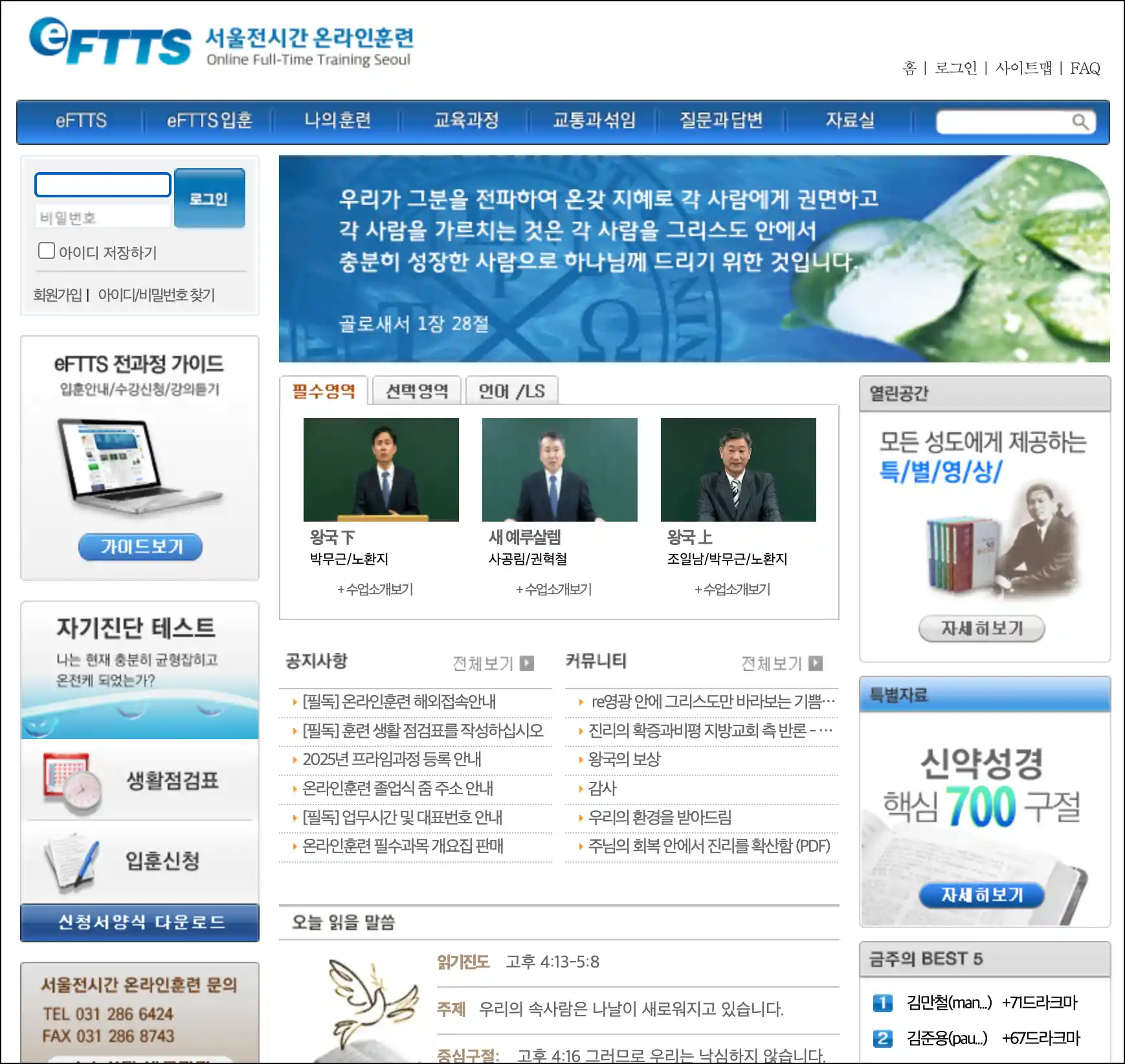 서울전시간온라인훈련(EFTTS)은 신앙인들을 위한 체계적인 온라인 훈련 프로그램으로, 누구나 시간과 장소에 구애받지 않고 영적 성장을 도모할 수 있도록 돕는 플랫폼이다.
