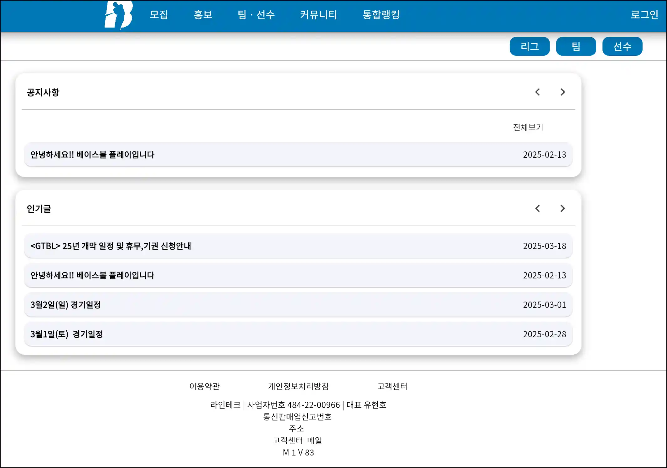 Baseball Play는 단순한 팀 운영을 넘어서, 아마추어 리그나 지역 대회를 위한 운영 플랫폼으로도 활용할 수 있습니다. 팀별 참가 신청, 경기 일정 편성, 순위 집계, MVP 투표 등 리그 운영에 필요한 전반적인 기능이 제공됩니다.